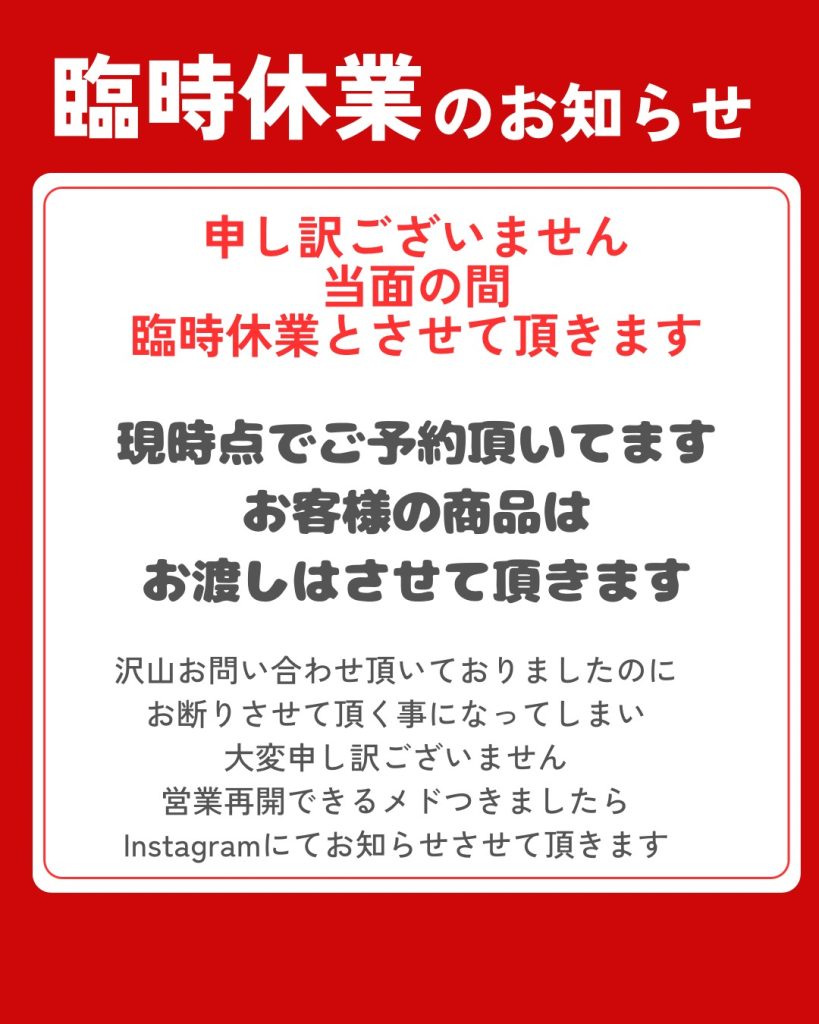 2025.12.17 未分類 ウールー 年内臨時休業 申し訳ございません 当面の間、臨時休業とさせていただいております。現時点でご予約をいただいてますお客様の商品はお渡しさせて頂きますのでご安心くださいませ。 たくさんのご連絡、お問い合わせを頂戴している中、お断りさせていただくことになってしまい、大変申し訳ございませんが、営業開始がご連絡できるようになりましたら、Instagramやこのホームページにてご案内させて頂きますので、お待ちくださいませ。